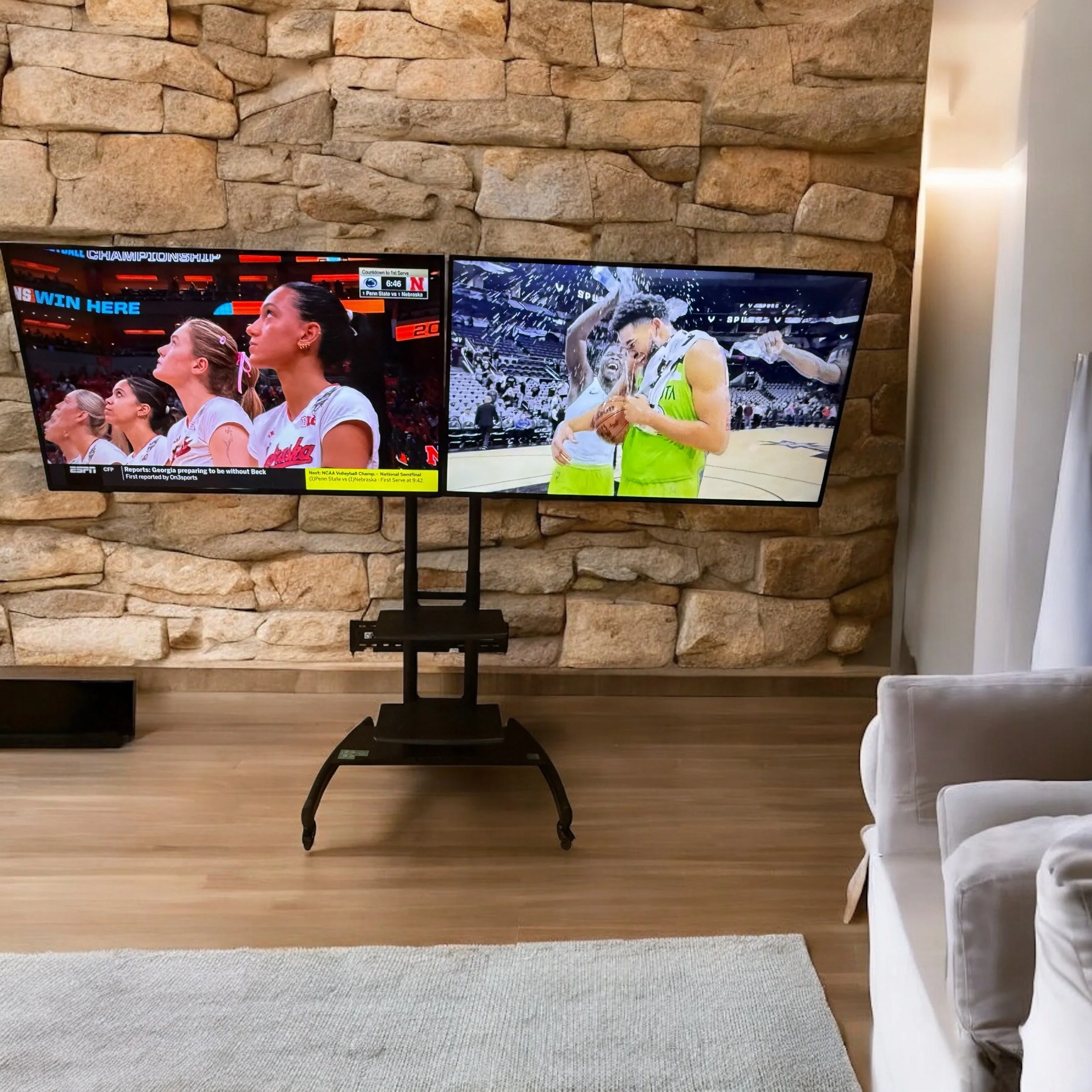 The tailgate trailer is equipped with dual 65-inch TVs for an enhanced viewing experience.